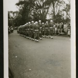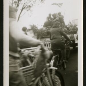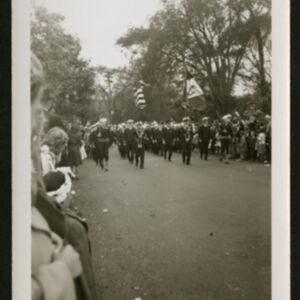Seven men on the review stand in front of City Hall, including Congressman Charles Clason and Mayor Edward Bourbeau, and one man in uniform (Air…