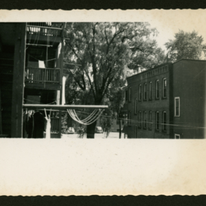 A wideshot of two apartments and small garage facing each other. (Undated)