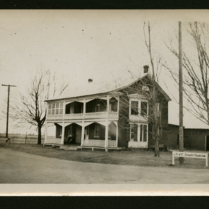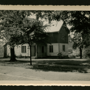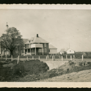 An image showing a house in the 1930s, shown with symetrical landscaping and cut grass. (Undated)