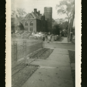 A black and white photograph of a two-story home, possibly the same as images CPL-Morrow-30, -31, and -32. There seems to be a tarp or tent set up in…