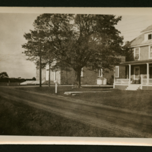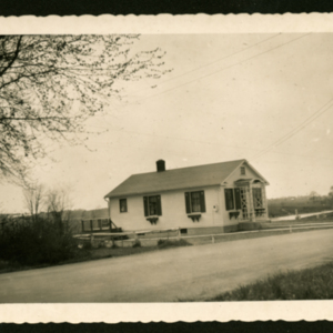 A wideshot of a one floor house in front a dirt road, and in front of a large plot of land; (Undated)