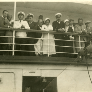3 ship's officers, 7 men and 6 women, lean against the rails of a cruise ship