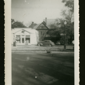 A wideshot of a sidewalk, showing a local "Socony" Oil store, with a 1930 Cheverlet Coupe parked on the outside of it; (Undated)