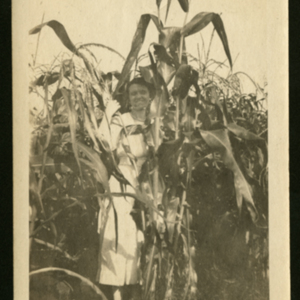 A photo of a woman posing behind a large crop of corn; (Undated)