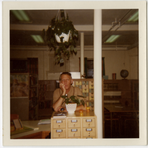 Al Page, Library janitor, standing behind the stacks in the Children's section