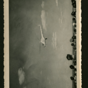An image showing a 1930s miltary rescue helicopter in the air flying from a distanc; (Undated)