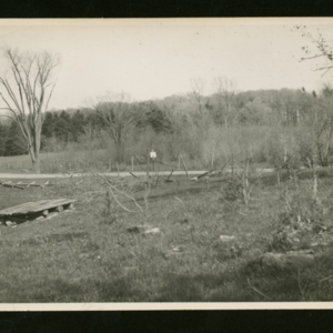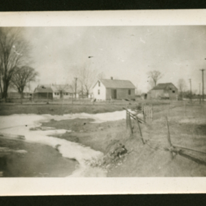 A wideshot of land seeming to be near a water stream that is frozen by the weather. Two houses and a farm are seen in the background; (Undated)