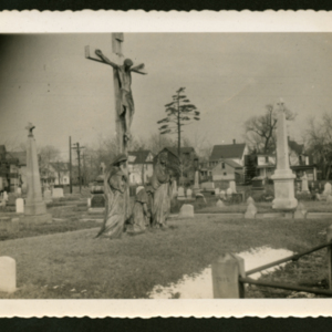 A wideshot photo showing a cemetary with a large religous statue in the center, with tombstones all over; (Undated)