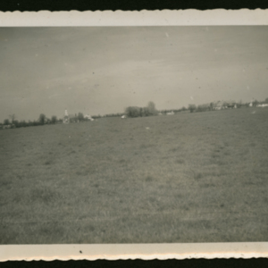 A wideshot photo showing a large plot of land, with a church and 7 more smaller building sin the distant background; (Undated)