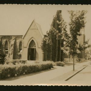 A wideshot of a church with a store on the left and cars parked outside of the large church building (Undated)