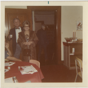 A man with a bowtie and a woman in a fur coat - two others to the side