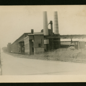 Black and white photograph of a brick building with trees around it. Photo is taken from an angle, showing the corner and two sides; building is the…