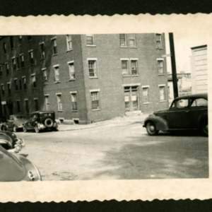 A road showing a large building overshadowing parked cars and making up the center of the street; (Undated)
