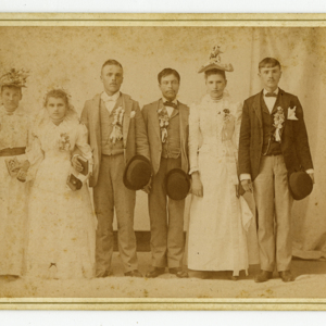 Cabinet card of a group (wedding party?): a woman and man to the right, with two men and two women in attendance, each wearing floral arrangments