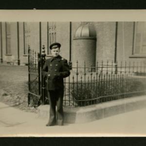 A portrait of the Adult wearing the US Navy hat and coat, seated and staring at the camera with buildings in his background; (Undated)