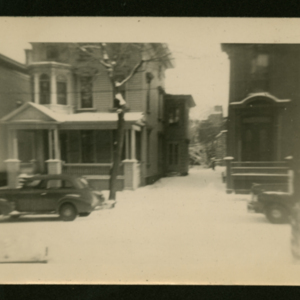 An image of a three storied house that faces the street and is slightly cut off by a tree in the middle.; (Undated)