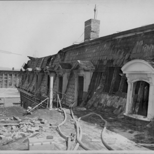 Market Square Hotel roof after fire on June 3, 1976, mill buildings on the Chicopee River in the background