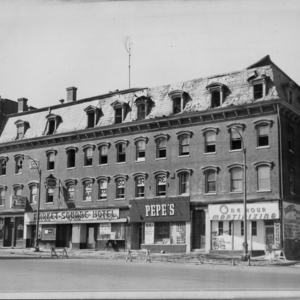A black and white photograph of several interconnected brick buildings on a street corner. The buildings are on the corner of Exchange and Center…