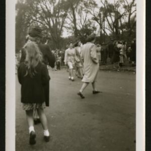 A double portrait of two women looking into the camera while standing near a sidewalk. (Undated)
