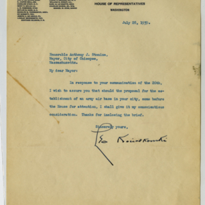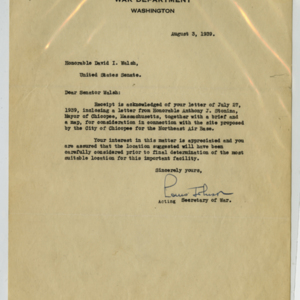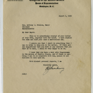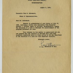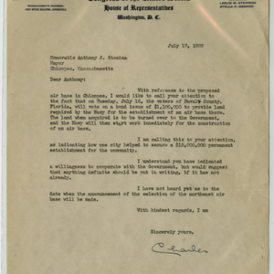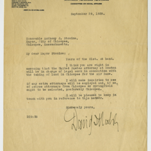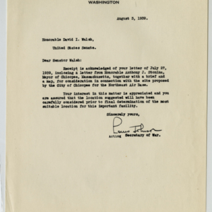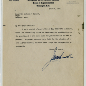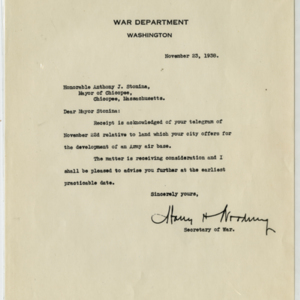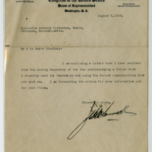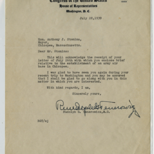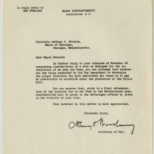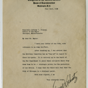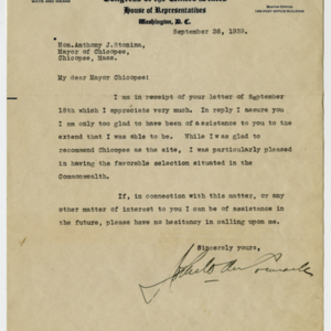 Series of 23 correspondences, mostly to Anthony J. Stonina, from various officials in Washington D.C. concerning the possible selection of Chicopee as…