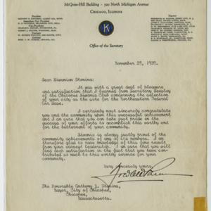 Items relating to Westover Air Reserve Base. Letter to Mayor Stonina from the local Kwanis Club stating congratulations for successfully locating the…