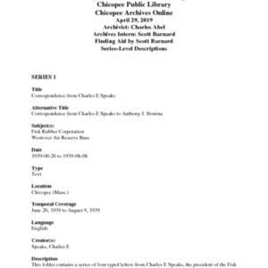 A series of four typed letters from Charles E Speaks, the president of the Fisk Rubber Corporation, to Anthony J Stonina, the mayor of Chicopee, MA.…
