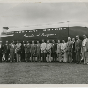 Anthony J. Stonina stands (fifth from left) with 16 other unidentified men beside the General Motors Parade of Progress bus