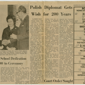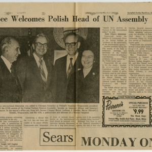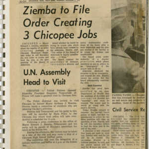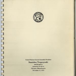 Materials from a single scrapbook related to the visit of United Nations General Assembly President Stanislaw Trepczynski to Chicopee, MA. These…