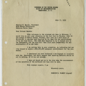 Items relating to Westover Air Reserve Base. A copy of the Wilcox Air Base Bill from the Seventy-Fourth Congress.