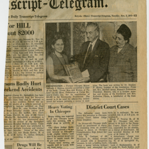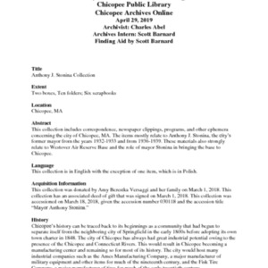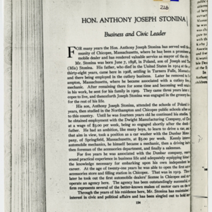 Miscellaneous materials related to the city of Chicopee and its former mayor, Anthony Stonina. An excerpt from Hampden County, 1636-1936 by Clifton…