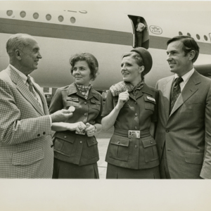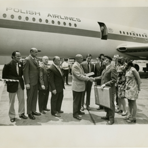 Anthony J. Stonina welcomes representatives of Polish Airlines and an interpreter (?) with gifts, upon the occasion of a visit by Stanislaw…