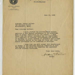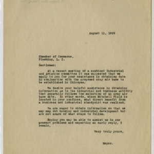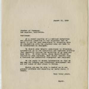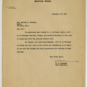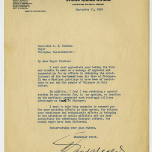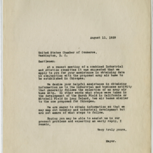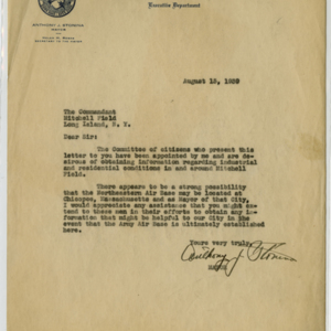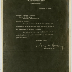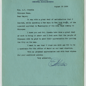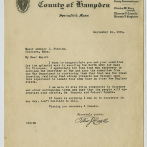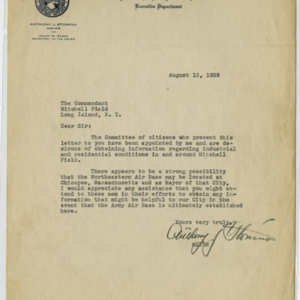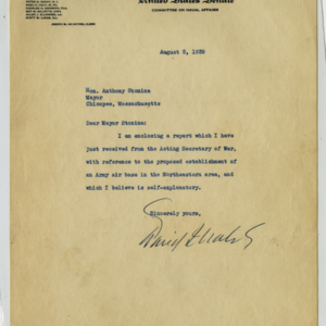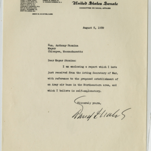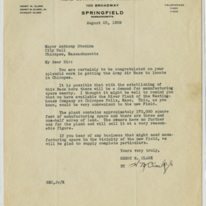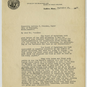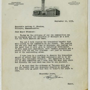 Correspondence between Anthony J Stonina and various other civic and business leaders in relation to the establishment of Westover Airbase.
