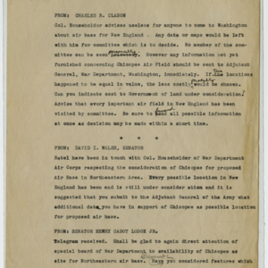 Items relating to Westover Air Reserve Base. Typed summary of events leading to the formation of Northeastern Army Air Corps Base.