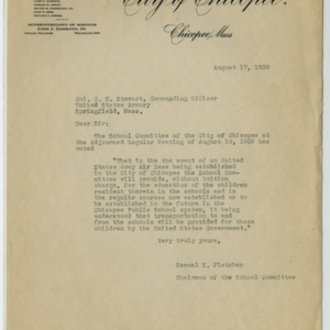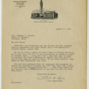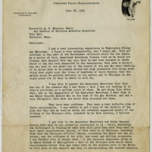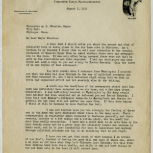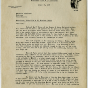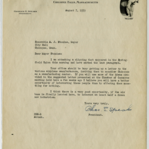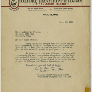 Items relating to Westover Air Reserve Base. Letter to Mayor Stonina from William Dwight, Managing Editor of the Holyoke Transcript-Telegram.