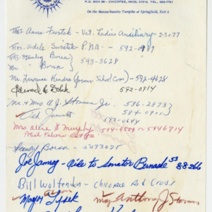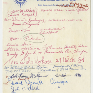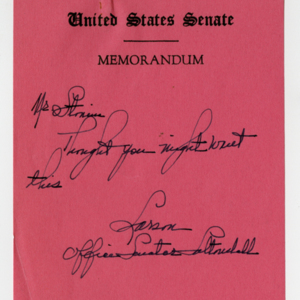 Miscellaneous materials related to the city of Chicopee and its former mayor, Anthony Stonina. Note on pink paper from U.S. Senator.