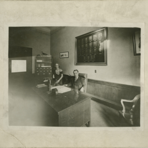 Mayor Stonina at his desk in City Hall, unidentified woman (assistant) to the left of the image - 21 former mayors pictured behind