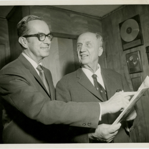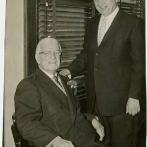 Anthony J. Stonina, recognized for a "Half-Century in Buisness" with unidentified man - Back of photograph says "Sun Rep 3 col cut Ret to Chamber…