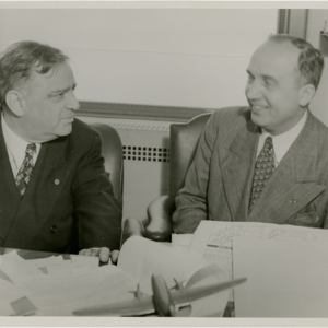 Anthony J. Stonina poses with a seated former mayor in City Hall (?) - "1-3-56 Messenger Photos 2 col Chicopee Former Mayors 56"