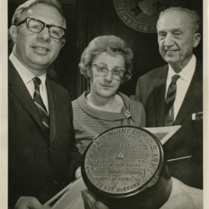Anthony J. Stonina receives the Corps of Engineers U.S. Army Plaque in his honor from an unidentified man and woman - "Holyoke-Chicopee AM 11/23/68 3…