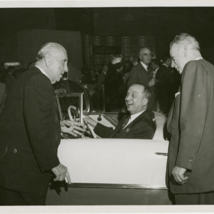 Anthony J. Stonina sits in a convertible car, talking to 2 other unidentified men, at a General Motors Parade gathering