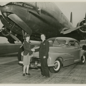 Anthony J. Stonina shakes hands with a member of Women's Army Corps on the tarmac at Westover ARB with a car and a Crescent Caravan transport plane in…