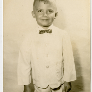 Black and white portrait of Paul Czjaka when he was a young boy, possibly age 5-6, dressed in a white suit with shorts and a bow tie. Zygmunt, Paul's…