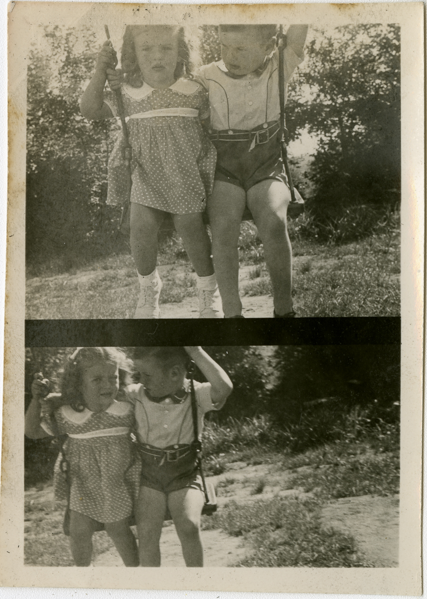Diptych of a girl and a boy sharing a swing. The boy is looking at the girl and as the girl looks at the camera.