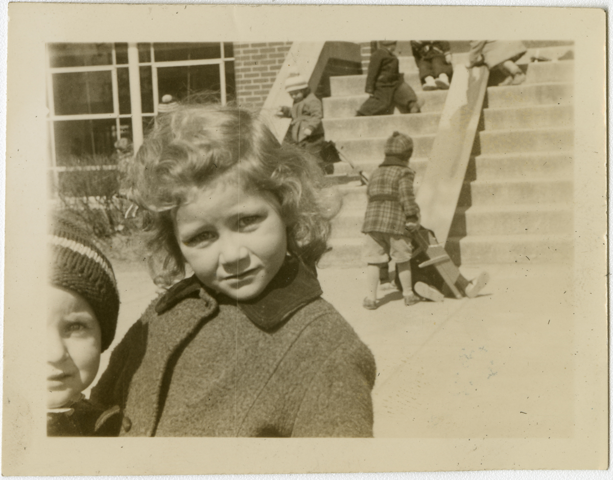 Portrait of a young girl looking at the camera while other children play outside on the exterior steps to the Bowe School.