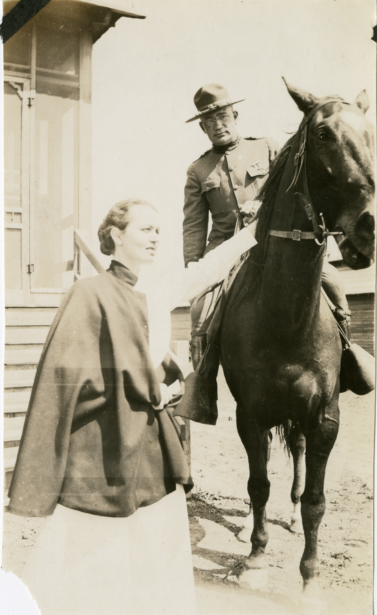 Nurse Hudson stands with Lieut. Heer (from Wisconsin 32nd Division) and Prince, the horse - Camp MacArthur - Waco, Texas - World War I