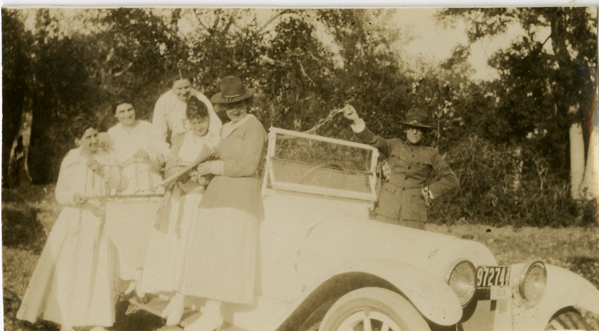 "The Picnic on Macgregor Road in the big white car" five Nurses (one wearing an officer's cap) and one officer - south of Camp MacArthur - Waco, Texas - World War I