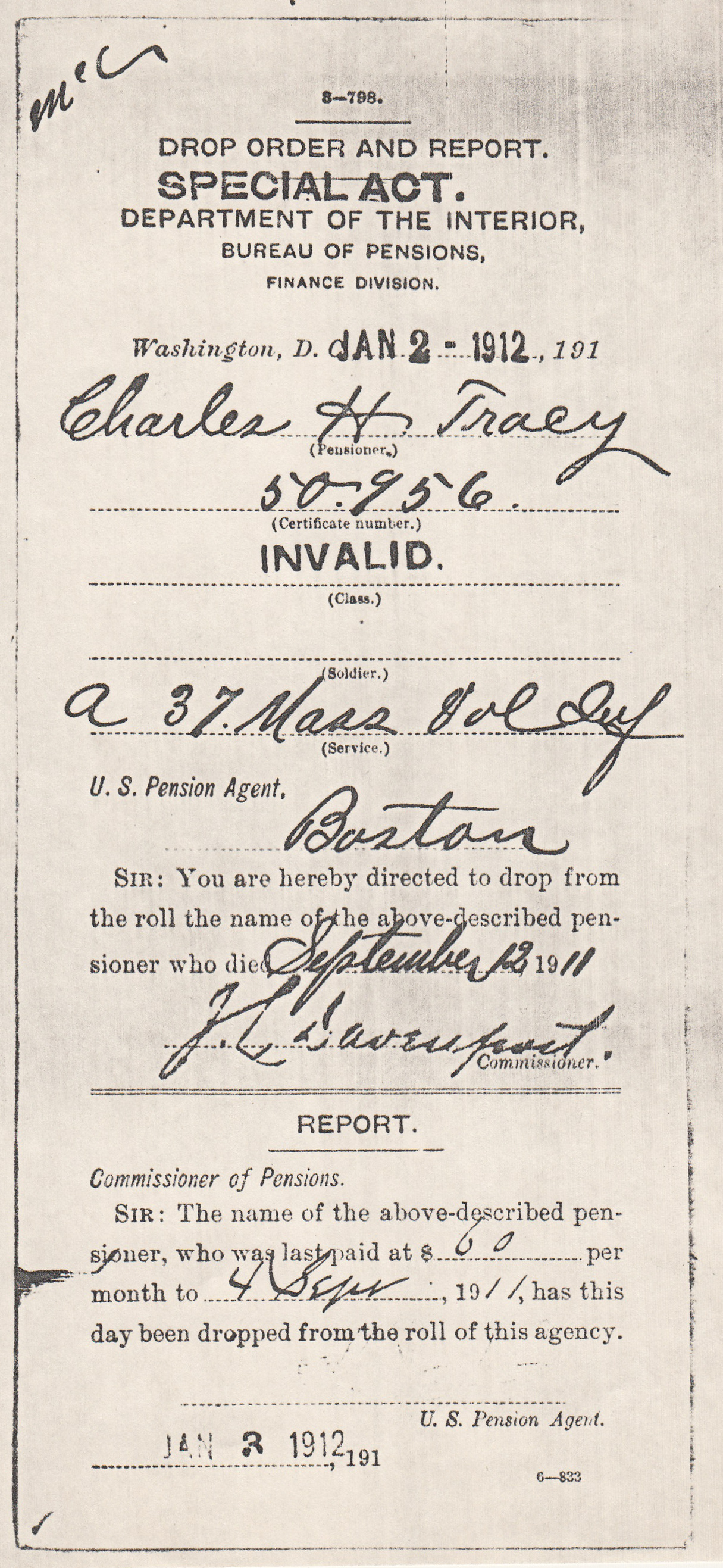 Order to U.S. Pension Agent to remove Charles H. Tracy from pension roll