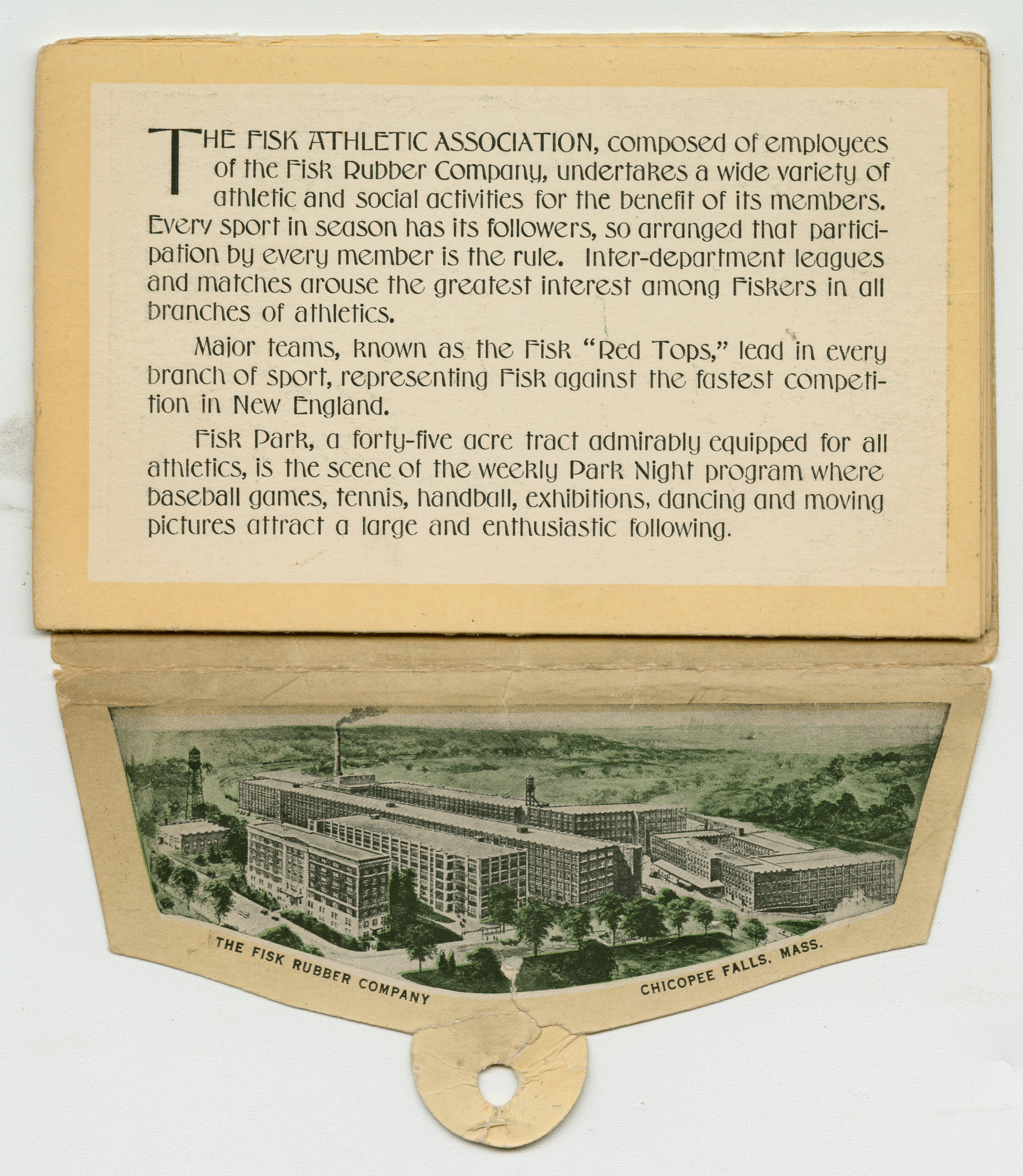 Fisk Park commerative postcards set with cover flap open. The flap photographs showing the Fisk plant is visible and there is text in the body of the card above the flap. The text describes the Fisk Athletic Association's activities.