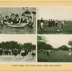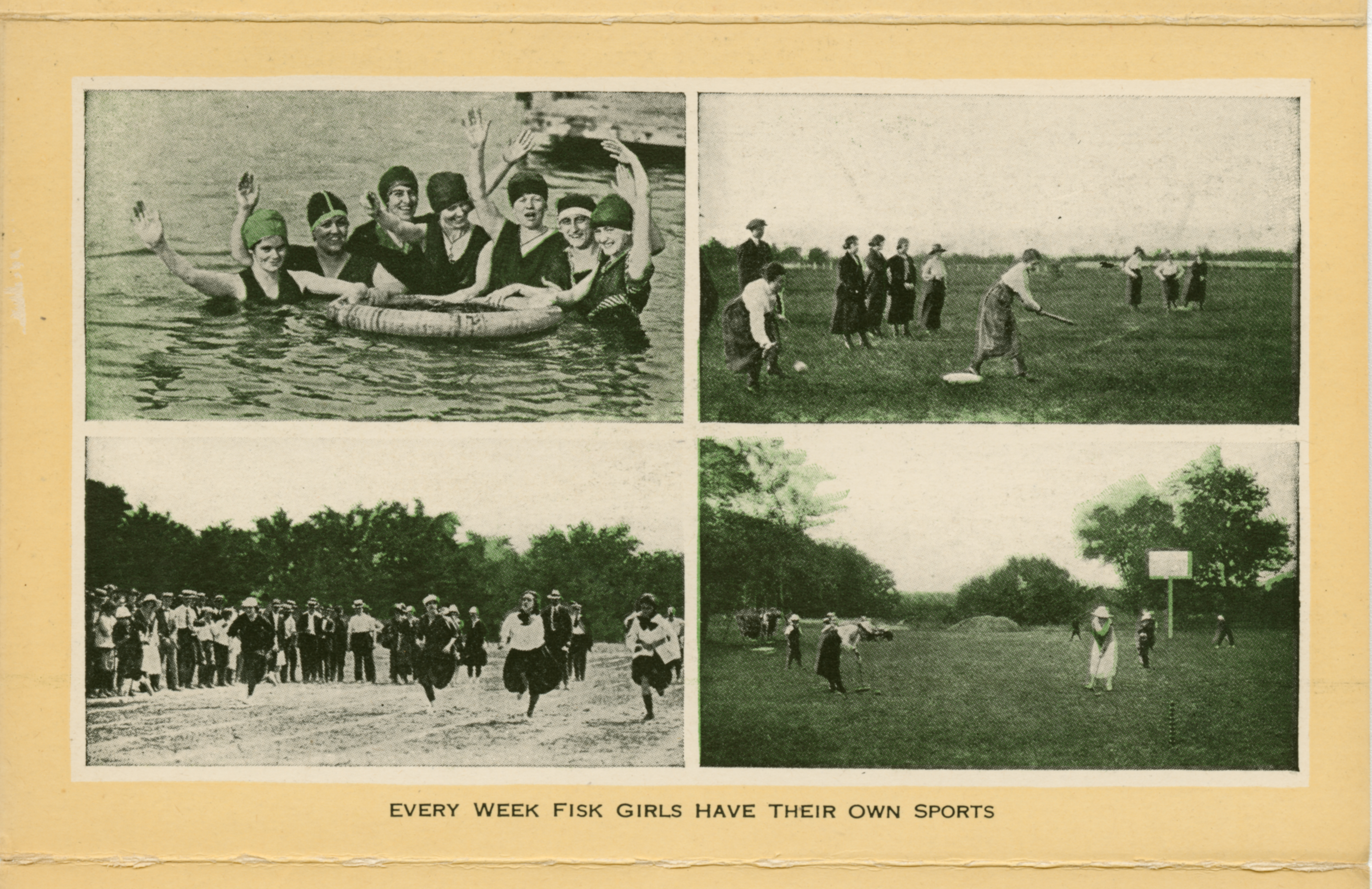 A four picture package showing diifferent sports available to women of the Fisk Athletic Association. The first image, top left, shows a small group of women submerged in water waving to the camera as they hold onto a floating tire tube. The second image, top left, shows several women playing baseball and others watching from the side. The third image, bottom left, shows a large group watching four women at the end of a race during a track event at the park. The final image, bottom right, is a wide photograph showing women playing corquet with a veiw of the park in the background. Grass, trees and scenery are all colorized green.