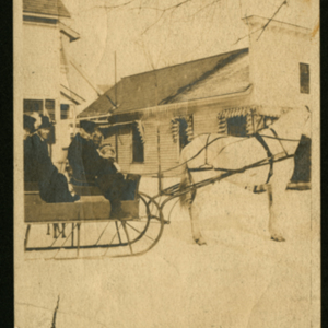 A small black and white snapshot of a horse-drawn sleigh with five passengers. The back is hand-labeled: "Front seat - David Spence + *Elizabeth…